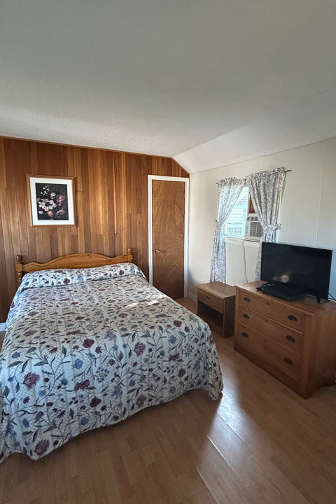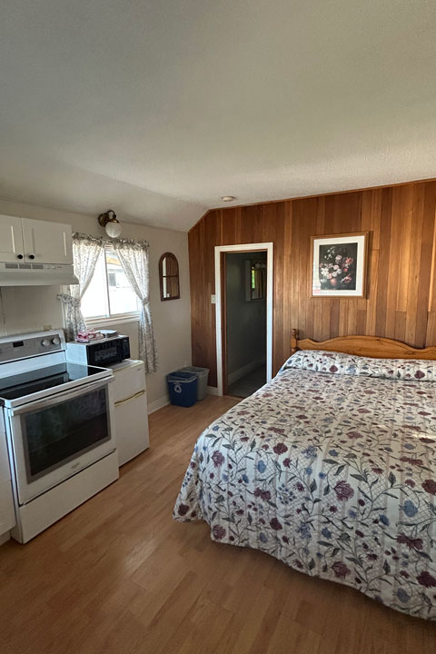 #120 ::: very charming bachelor, queen bed, love seat, full kitchen, 4-pc bathroom, a/c, electric fireplace, picnic table and BBQ.